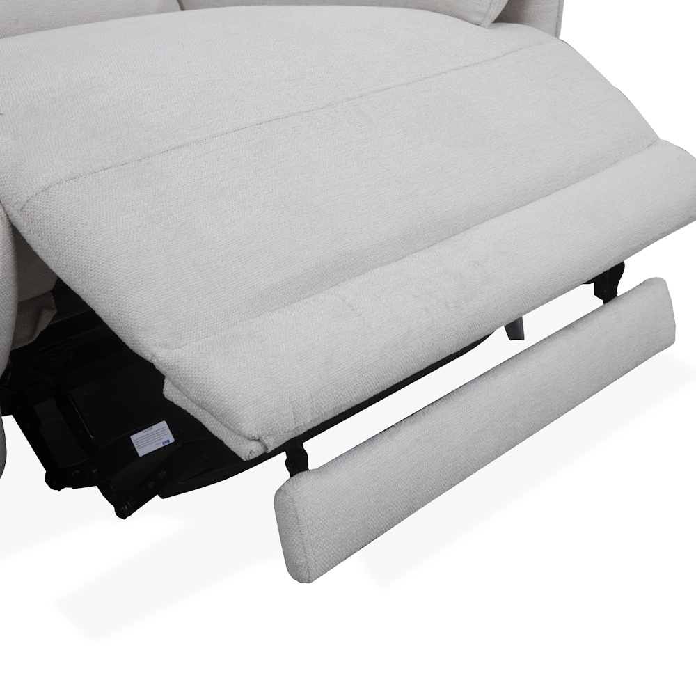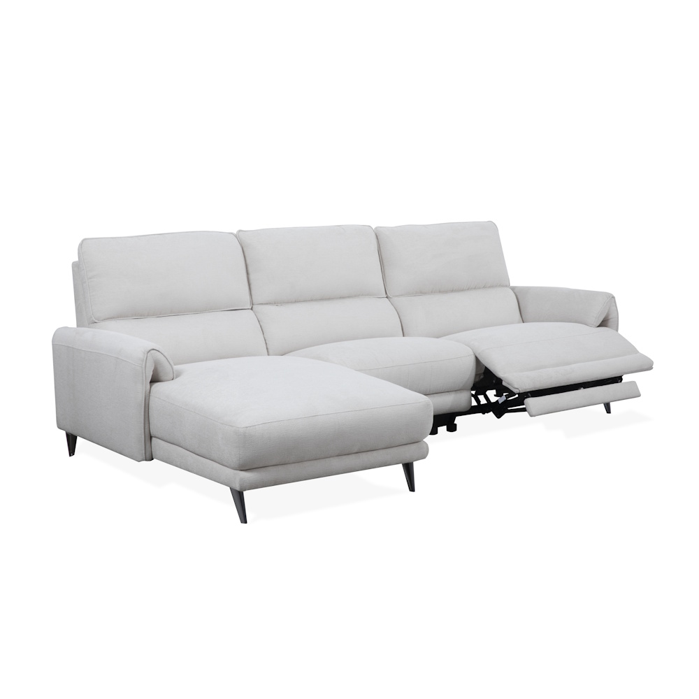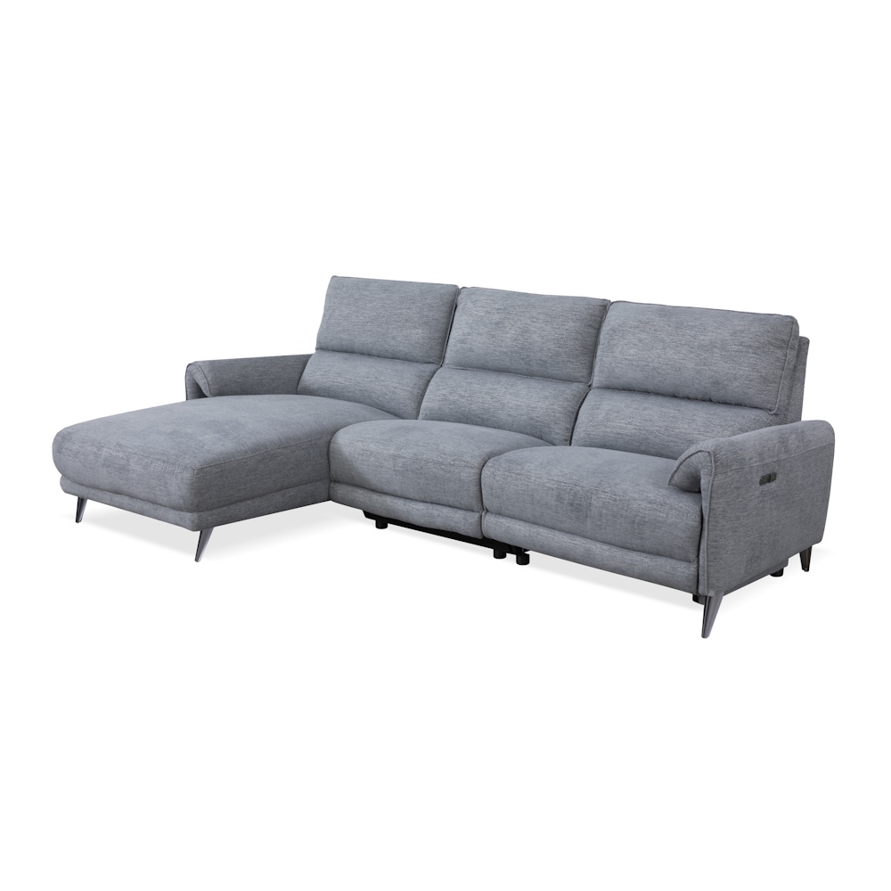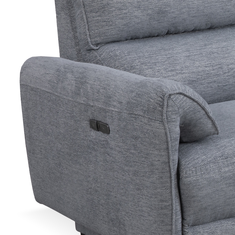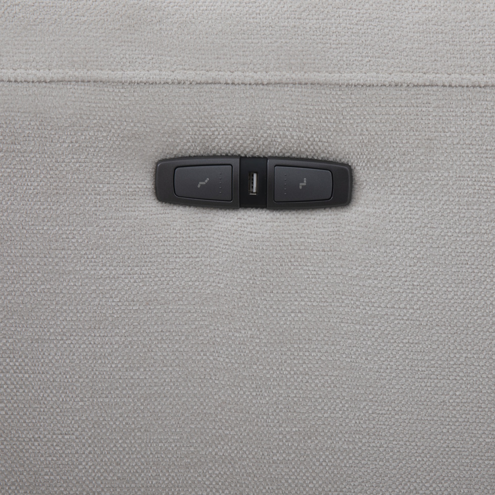 Chaiselongue con estructura de madera de pino y tablero de partículas, con suspensión de cincha elástica y muelle zig-zag de gran resistencia, relleno de fibra y espuma de poliuretano HR-35 kg., tapizada en tela de alta calidad con proceso de cosido computerizado. Dispone de relax eléctrico en módulo de brazo, con botonadura de control que incluye puertos USB y Micro USB.