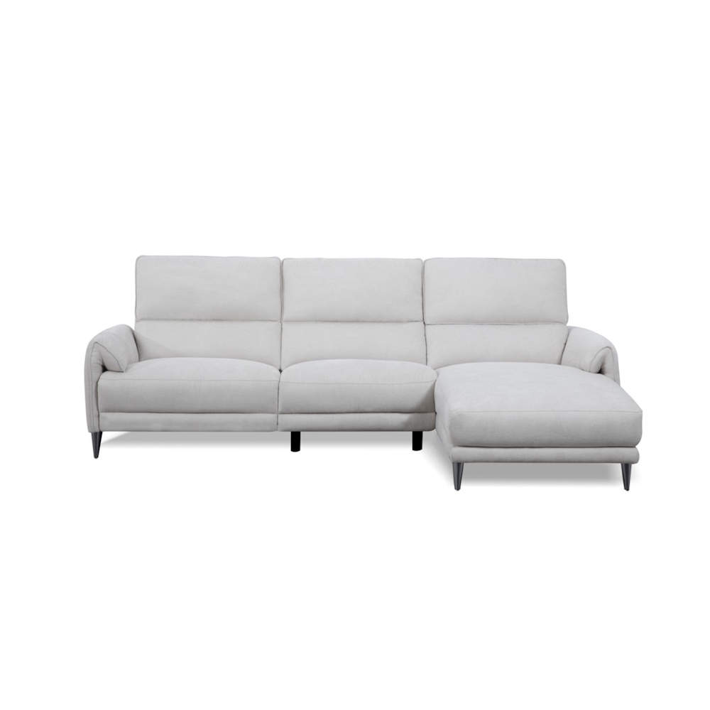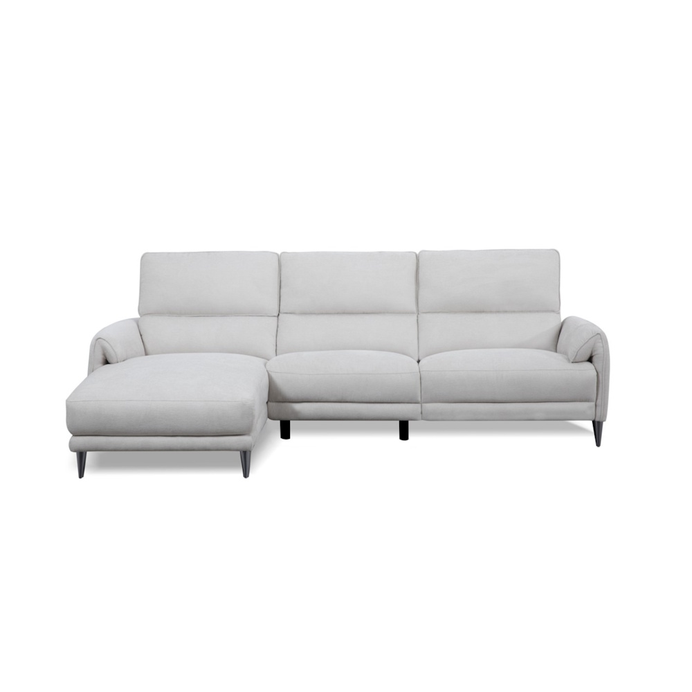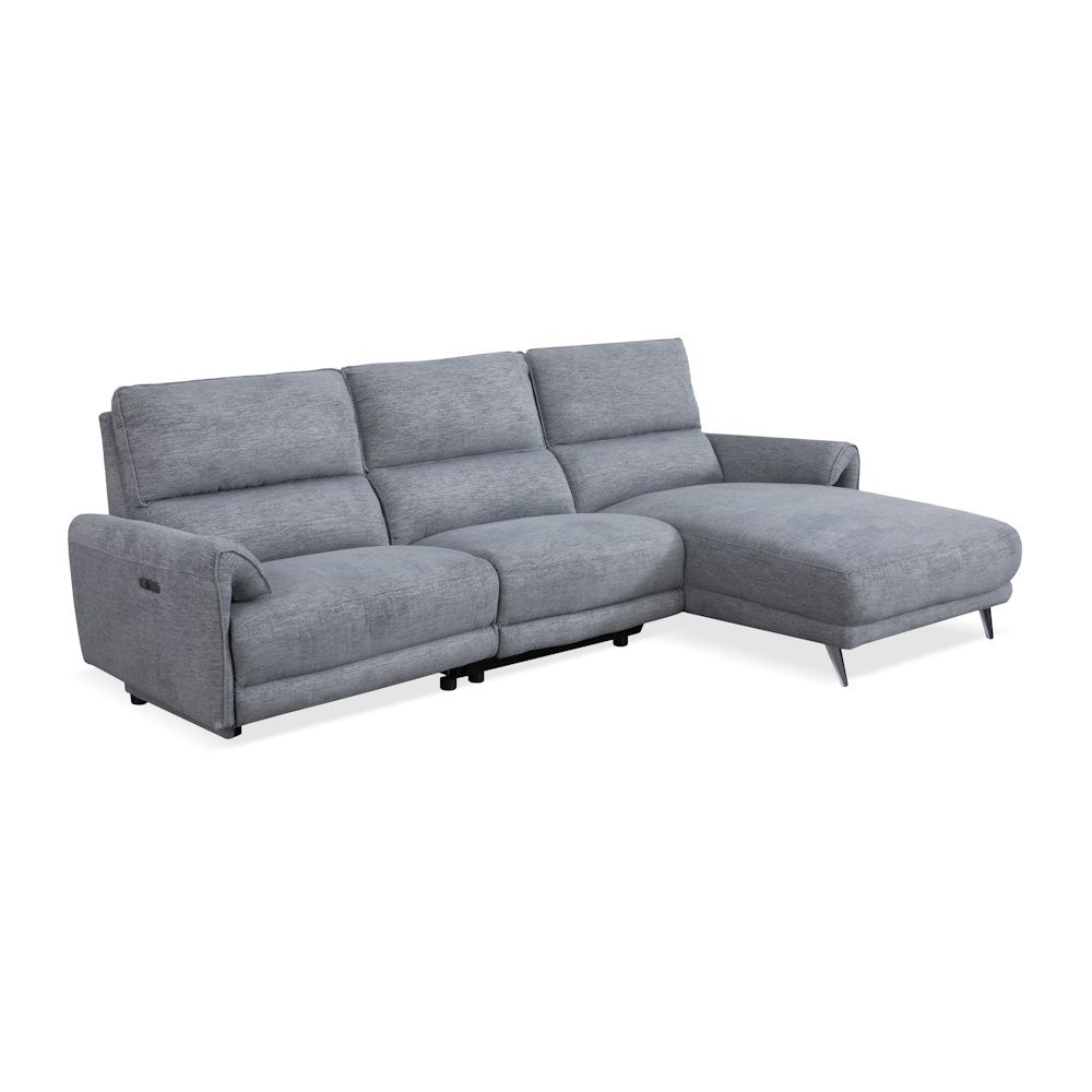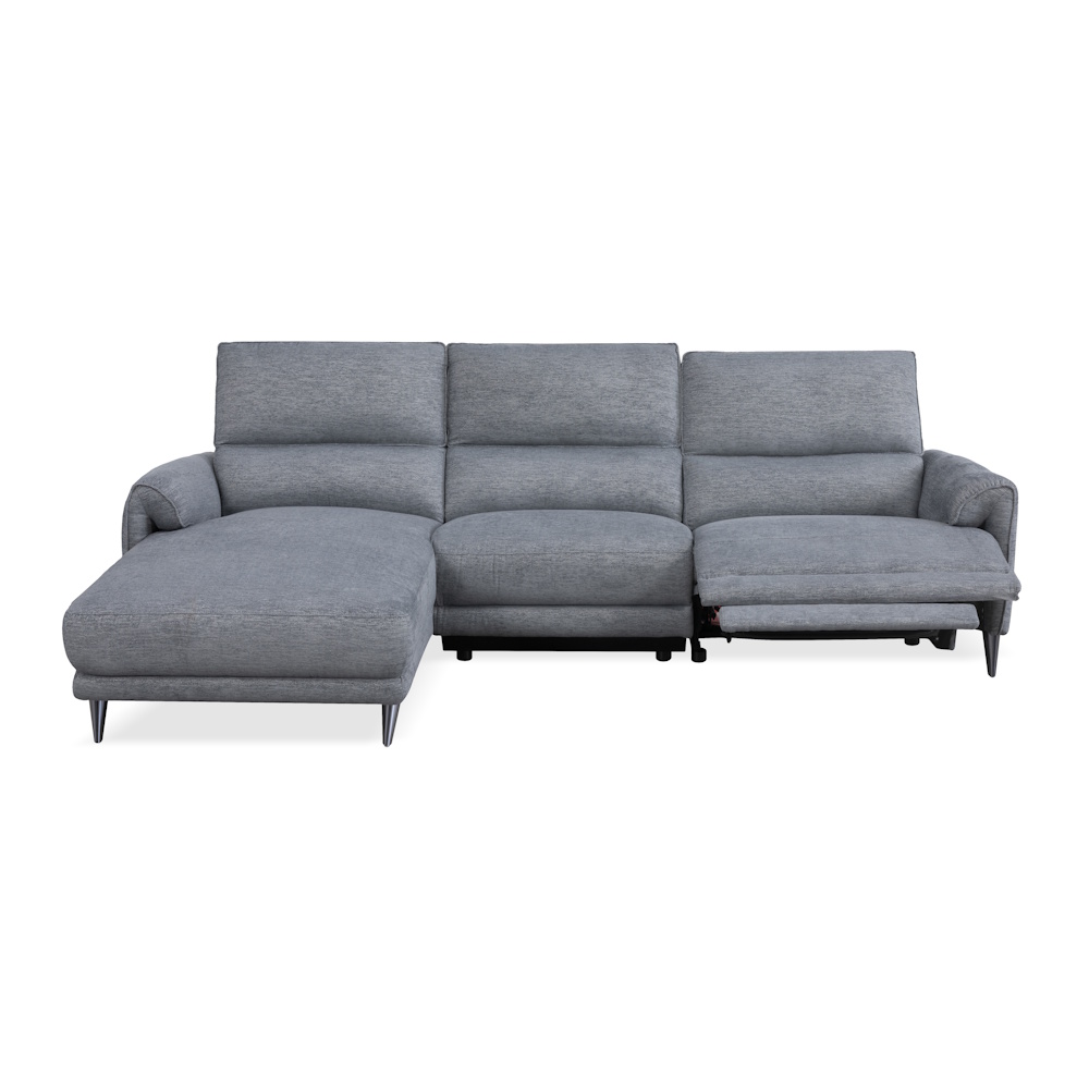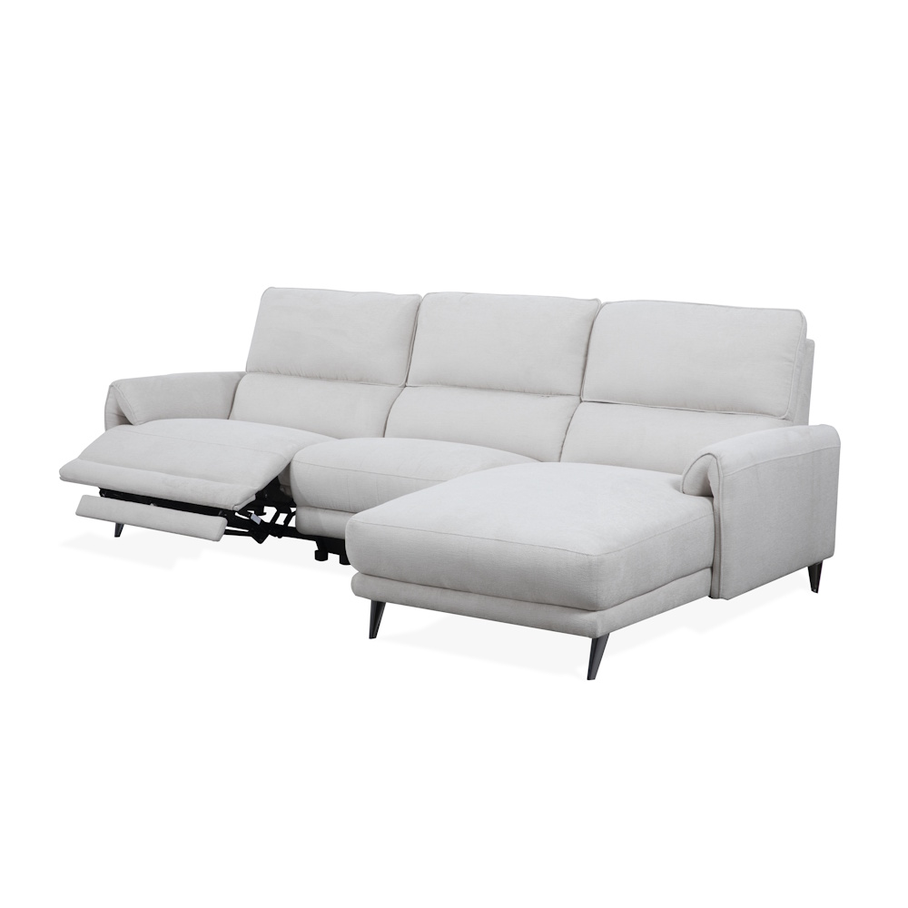 Chaiselongue con estructura de madera de pino y tablero de partículas, con suspensión de cincha elástica y muelle zig-zag de gran resistencia, relleno de fibra y espuma de poliuretano HR-35 kg., tapizada en tela de alta calidad con proceso de cosido computerizado. Dispone de relax eléctrico en módulo de brazo, con botonadura de control que incluye puertos USB y Micro USB.